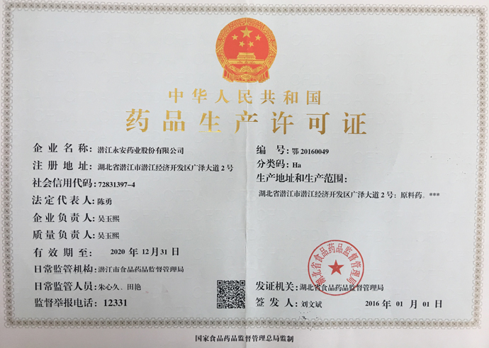 潛江永安藥業股份有限公司成立于2001年,坐落于江漢平原腹地潛江市國家高新技術產業開發區,占地500余畝,注冊資金貳億玖仟肆佰陸拾捌萬貳仟伍佰元整,是一家擁有自主知識產權的國家高新技術企業。公司股票于2010年3 月5日在深圳證券交易所掛牌上市(股票代碼為002365)。公司具有雄厚的技術開發能力,是湖北省創新型企業和湖北省知識產權建設示范企業。公司研發平臺分別被認定為省級企業技術中心和湖北省功能性食品添加劑工程技術研究中心。 經過多年的發展,公司形成了以食品及藥品添加劑牛磺